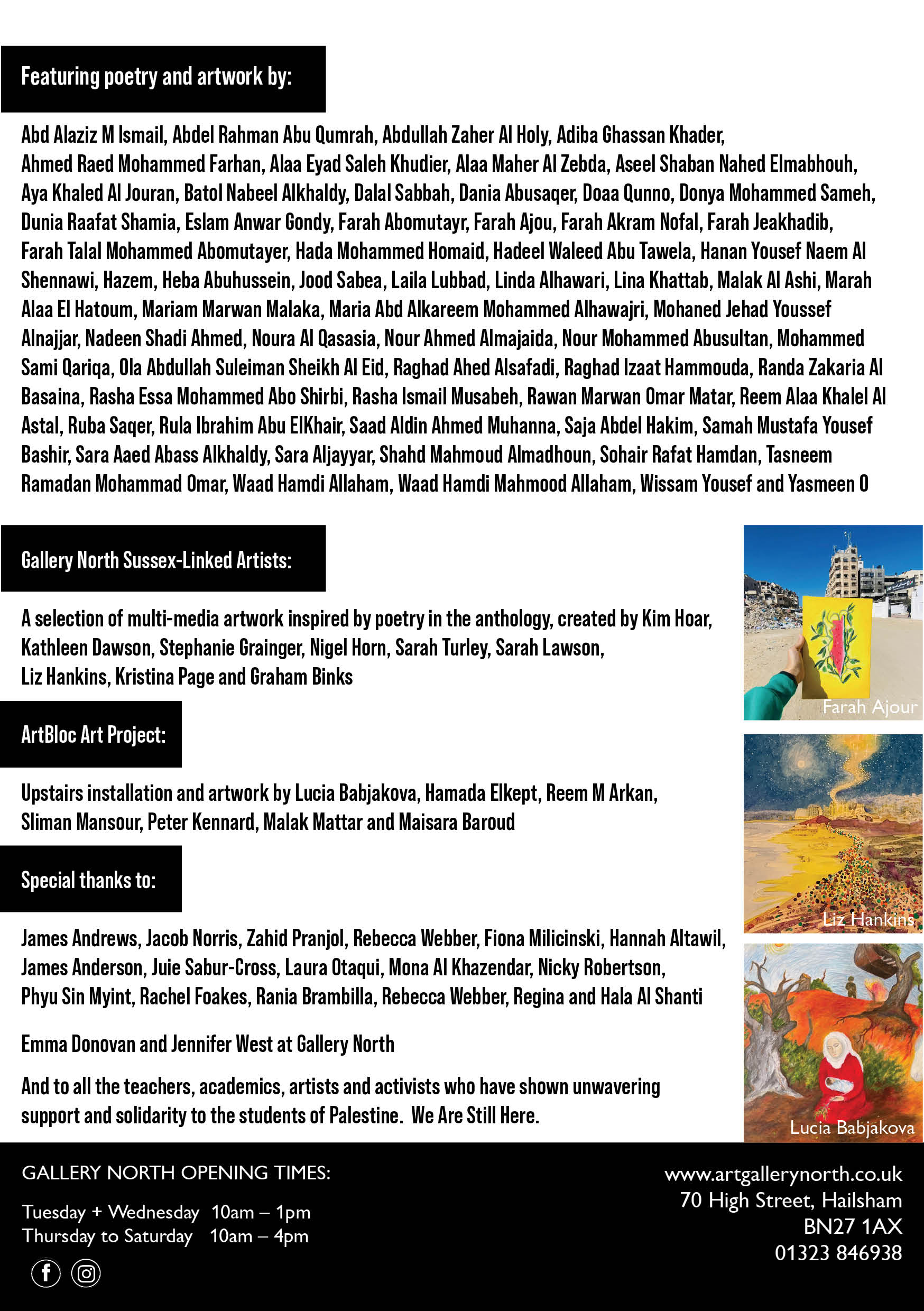 Alongside selected poems and visual material from the anthology, the exhibition will feature new work by Sussex artists who have created pieces in response to the students’ writing. These include paintings, music, textiles and mixed material works, offering creative interpretations of themes such as hope, grief, memory and resistance. There will also be an art installation from ArtBloc – a Brighton based mobile art exhibition of Art for Palestine featuring well known Palestinian artists.