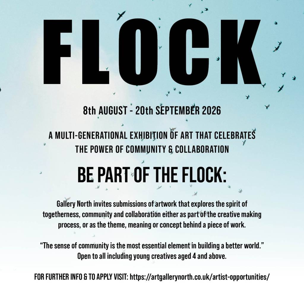 For their upcoming exhibition ‘Flock’, Gallery North invites submissions of artwork that explores the spirit of togetherness, of community and collaboration. The artist’s response to this can either be through the way that the work is created or made, or as the central theme, response or concept behind the piece of work. It could also be made by a collective, group or partnership e.g. a group of artists, by a parent artist and child, with groups of friends, siblings, community groups and so on. Alternatively the artwork could be created over time during the exhibition, by inviting visitors to come into the gallery and contribute towards the making of the artwork… All interpretions of this theme are welcome.