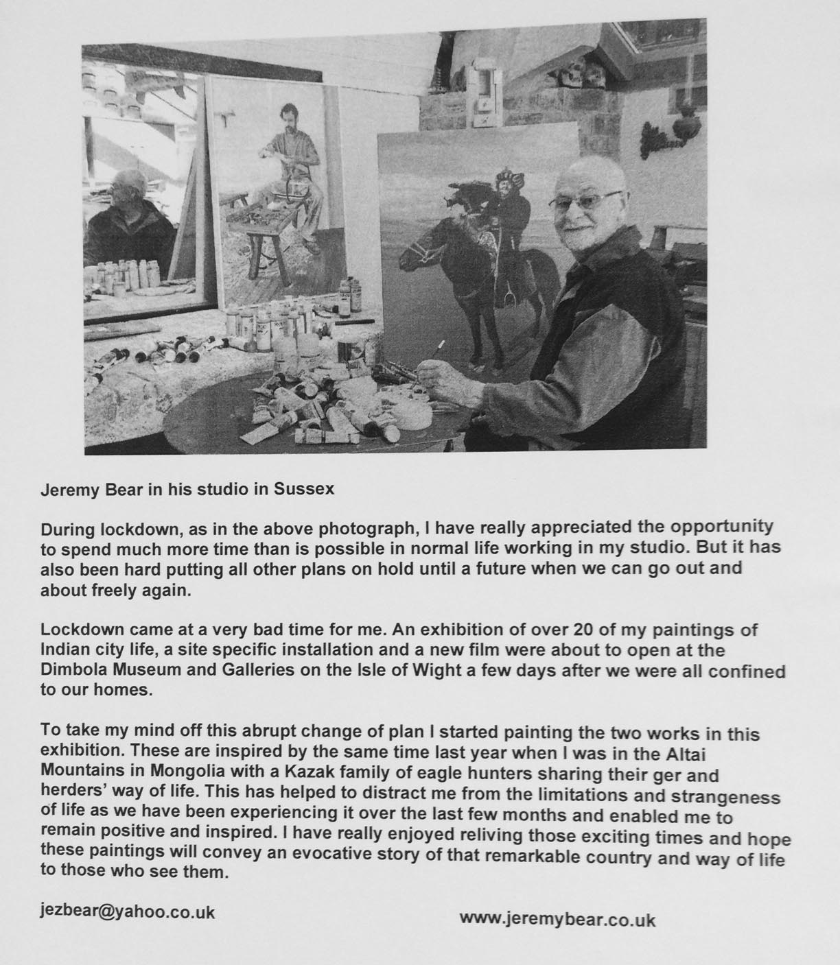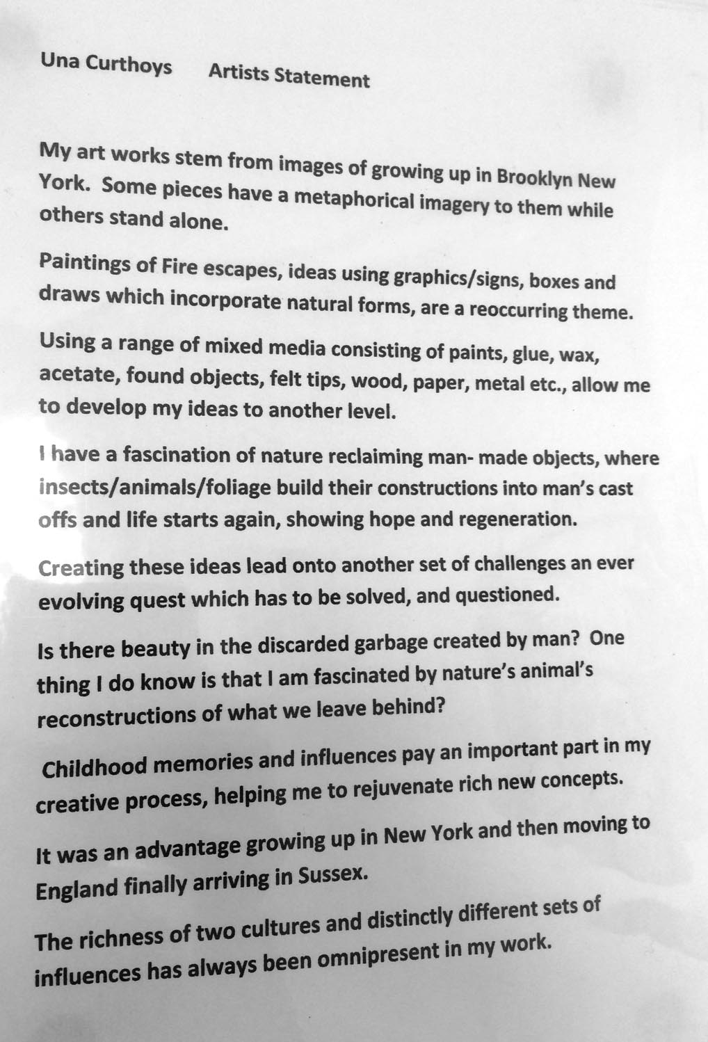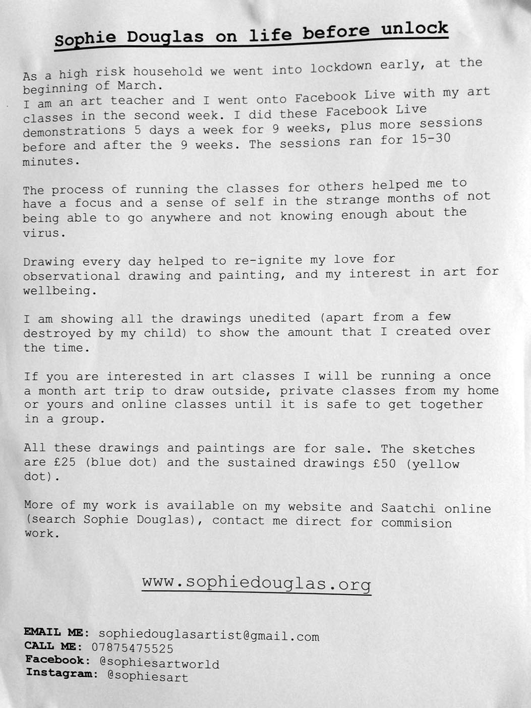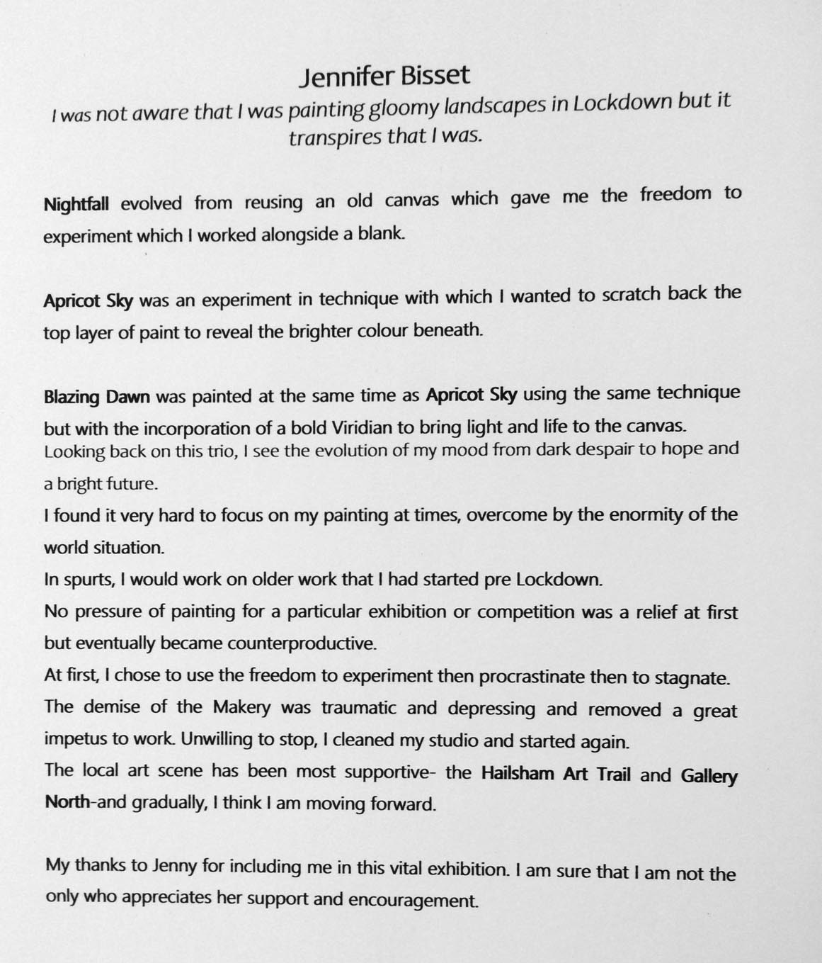 The works in this exhibition have been created during the Covid-19 lockdown, a strange period in all our lives which inspired creativity and reflection in some artists and caused lethargy in others. The following list of names links to selected individual artist statements: