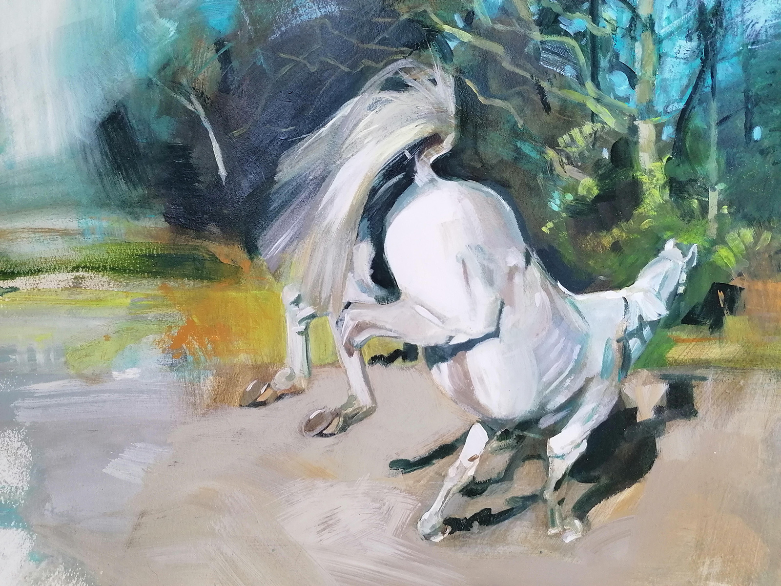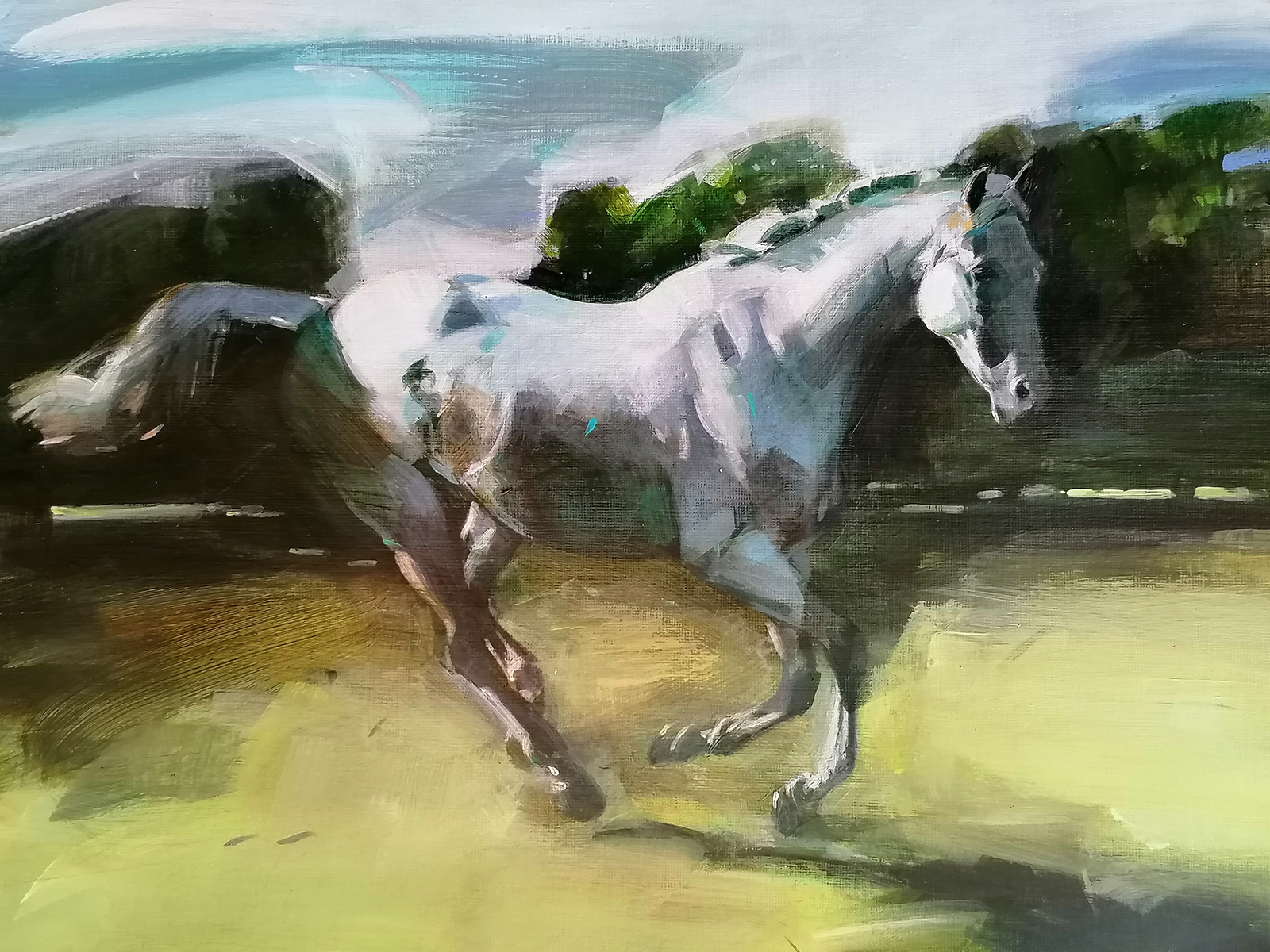 I worked throughout lockdown with an intense energy and focus. My experience of global catastrophe lent the process of painting a sense of demanding urgency. My subject matter reflects my own absorption in the powerful processes of nature. Roaring fire, wind whipped waves and the wild, powerful movement of the horse.